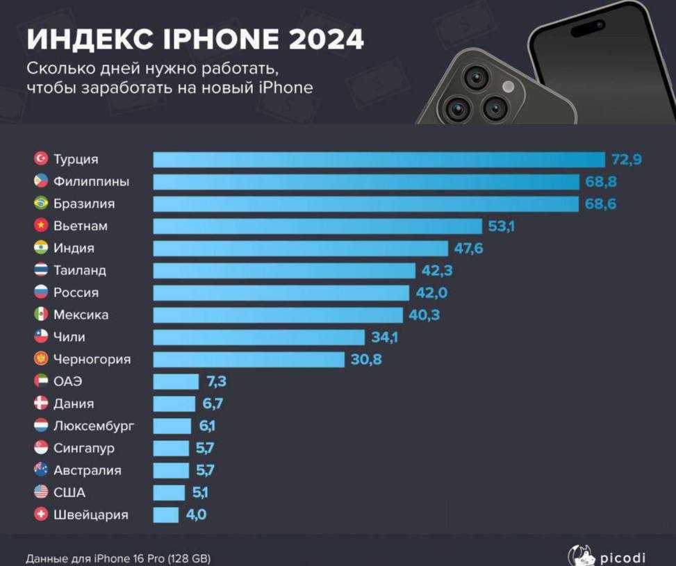 Россиянам рассказали, сколько должен отработать среднестатистический житель страны, чтобы купить себе новый iPhone 16 Pro. Ежегодную статистику составили аналитики Picody.