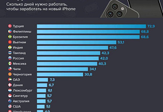 На первом месте по доступности нового телефона оказалась Швейцария. Там местным жителям нужно отработать только четыре дня. Также в топ-5 стран вошли США, Австралия, Сингапур и Люксембург. А на последнем месте – Турция. Туркам нужно потратить почти 73 дня.