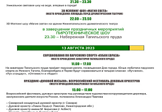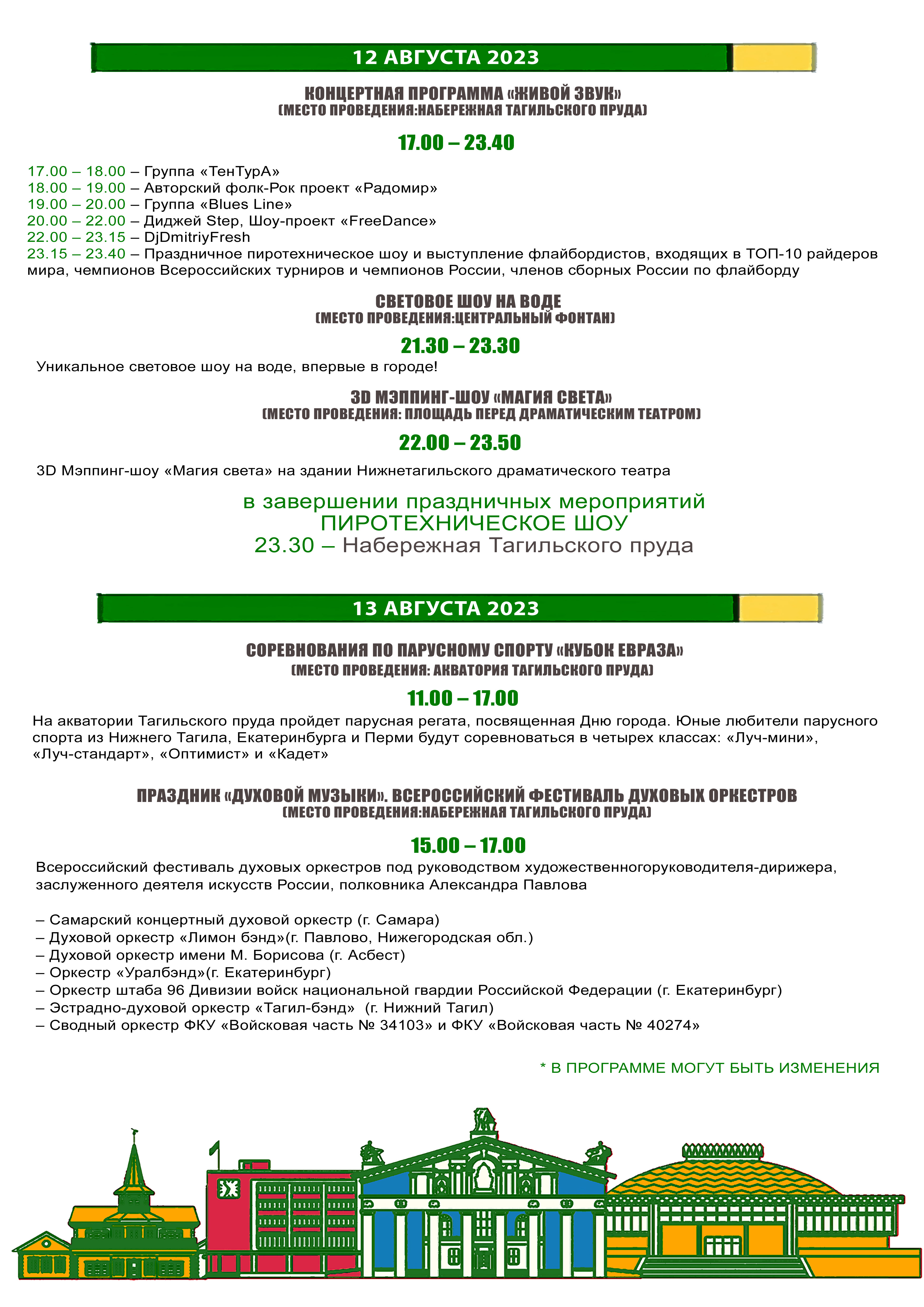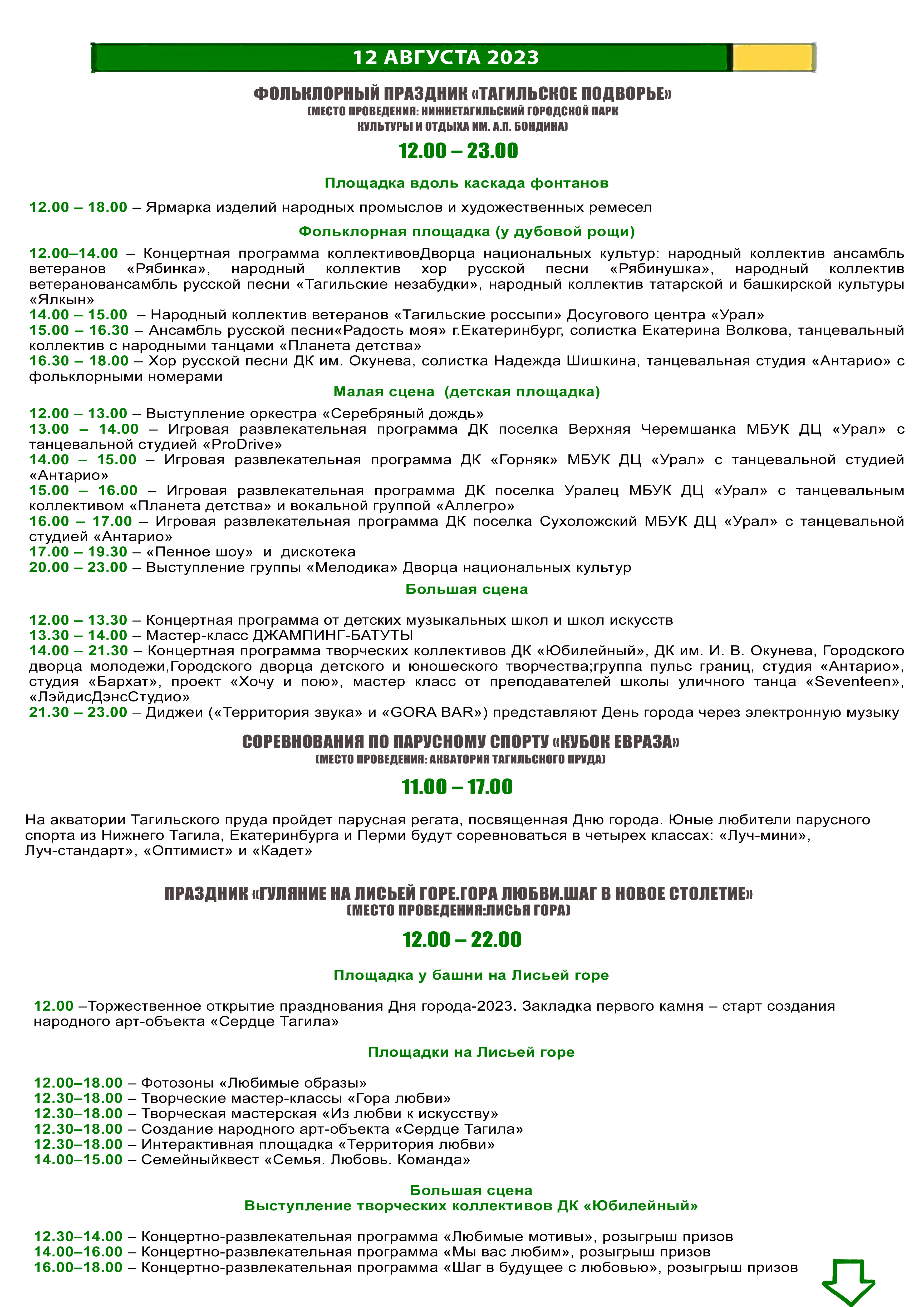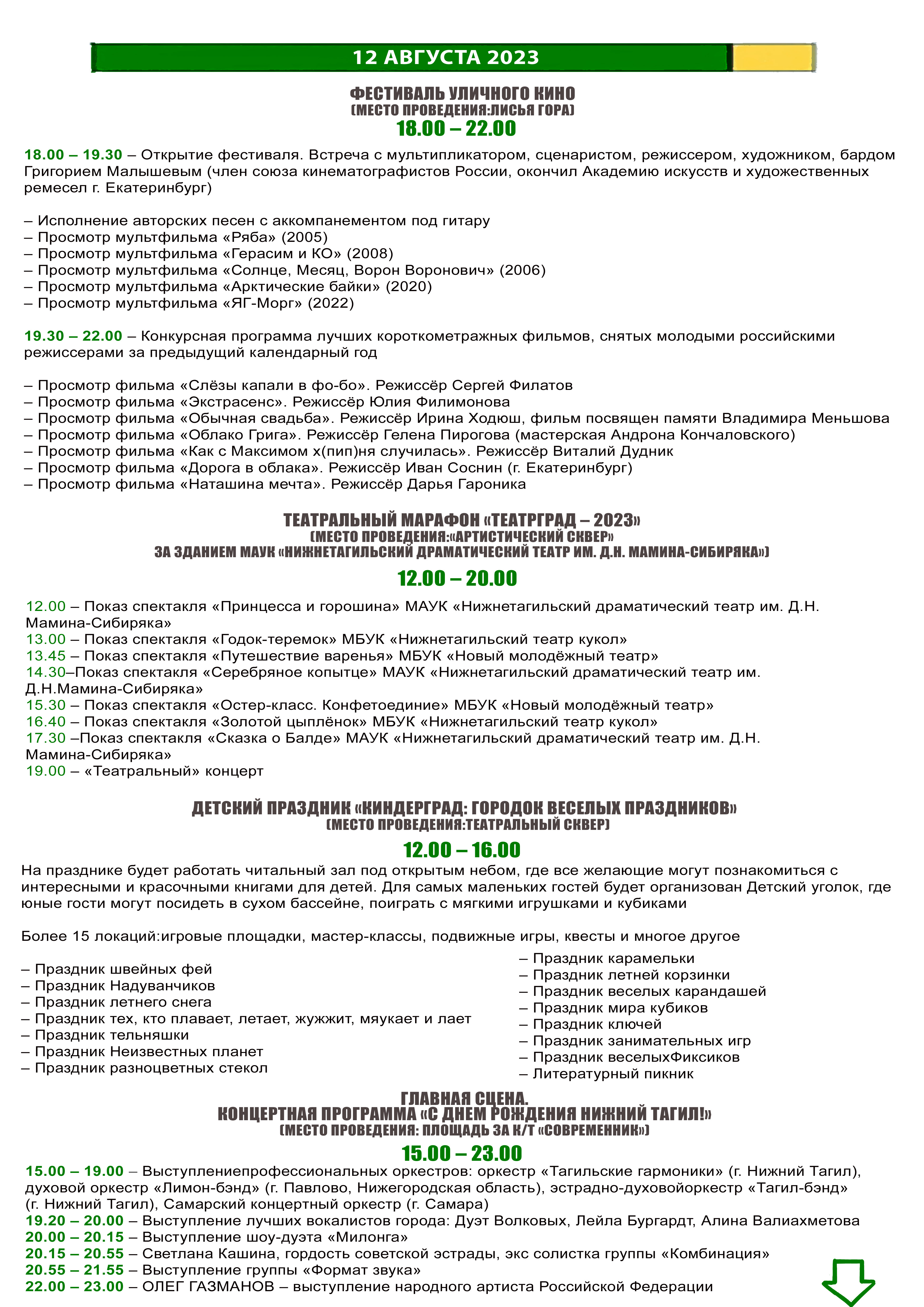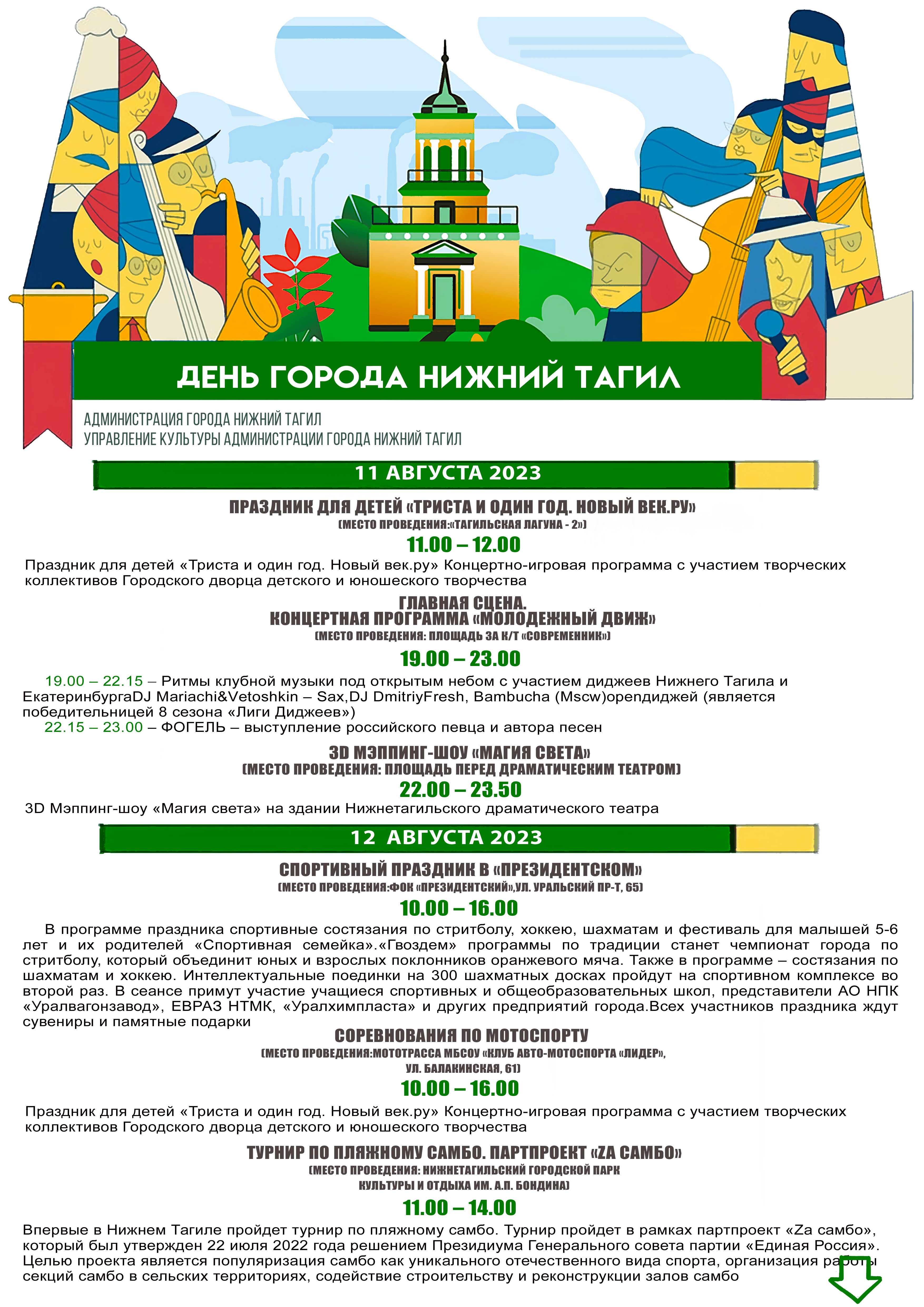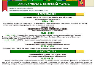 Самое ожидаемое событие лета в Нижнем Тагиле уже на подходе – День города! В этом году праздник обещает стать поистине захватывающим, ведь на афише заявлены увлекательные мероприятия и развлечения для всех жителей и гостей города. Мероприятия запланированы на 11-12 августа, и каждый найдет что-то особенное и интересное для себя.