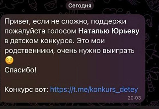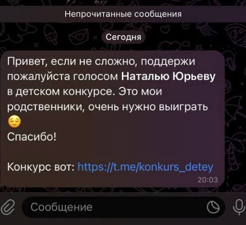 В России появилась новая мошенническая схема, о которой сообщили в пресс-службе Управления по организации борьбы с противоправным использованием информационно-коммуникационных технологий МВД России. Пользователям Telegram от знакомых контактов, которые давно не были онлайн, приходят сообщения с просьбой проголосовать за кого-либо.
